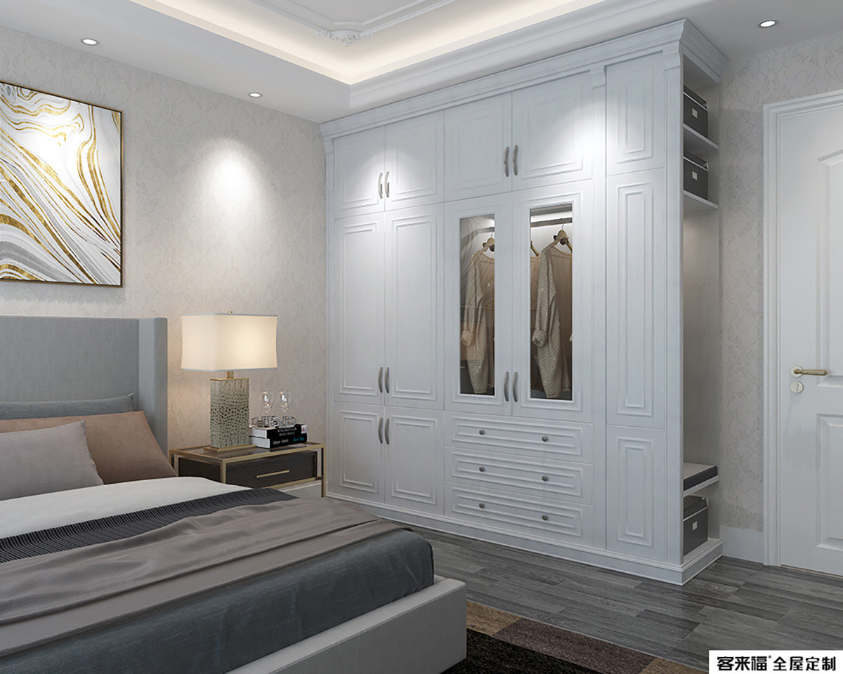 The combination of the bedroom and the cloakroom enlarges the storage function, and the combination of natural wood color and warm white is fresh and natural.