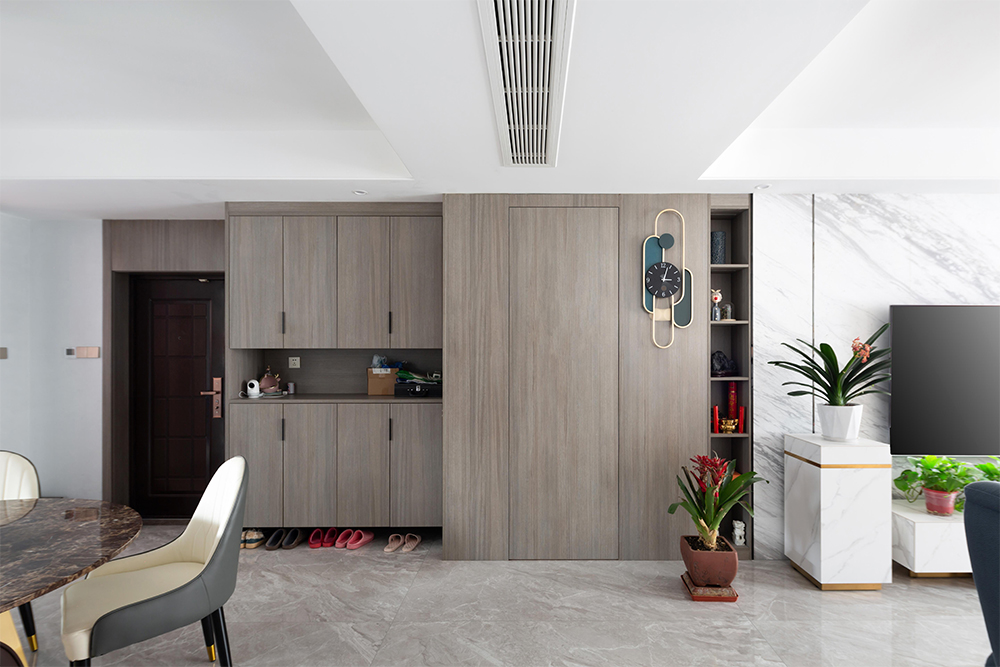 从玄关处进门,可以看到在平行于玄关的一边处做了整面式的柜子,采用整柜到顶的方式,灰橡木色的柜门与大理石纹路的地砖,在颜色上遥相呼应,形成了一种高雅静谧的感觉。