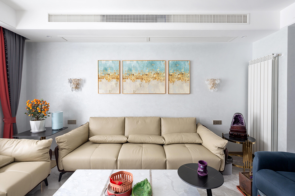 从客厅处映入眼帘的便是郁郁葱葱的绿植,体现出屋主对于生活认真的态度。客厅的墙面板采用白色大理石纹路,墙面的装饰画给整个空间增添了美感。