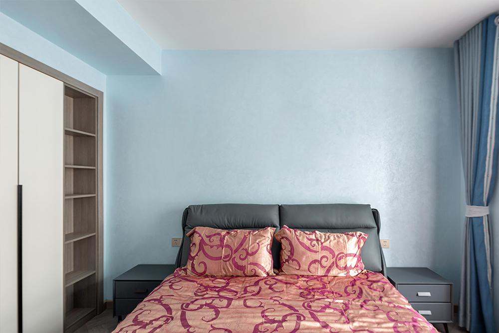 用蓝色墙布覆盖在墙面,对墙面起到很好的保护作用。次卧最大的亮点在于房间内设计了一个隐藏的衣帽间,在柜子内做出了U形的布局,将内部空间分层,可以放置衣物和棉被。空间内部既不会显得突兀,关上柜门之后内部空间更加完整。
