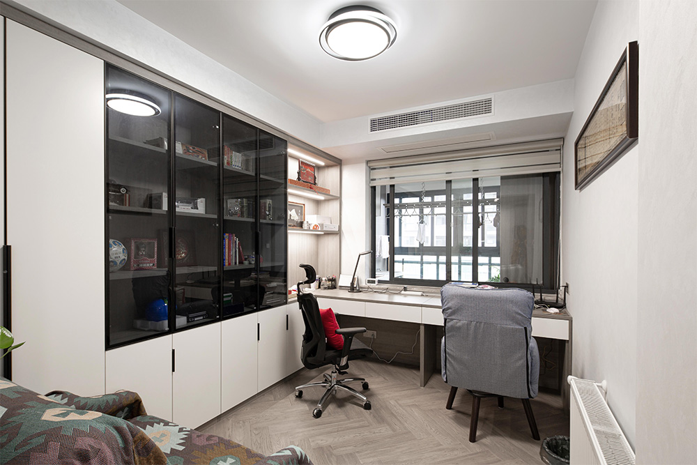 书房内部的空间十分的大气,白色加黑色玻璃柜门的设计,分层储物方便又快捷。长条的书桌可以同时容纳两个人办公,劳累的时候通过窗户便可以眺望远方,缓解疲劳。