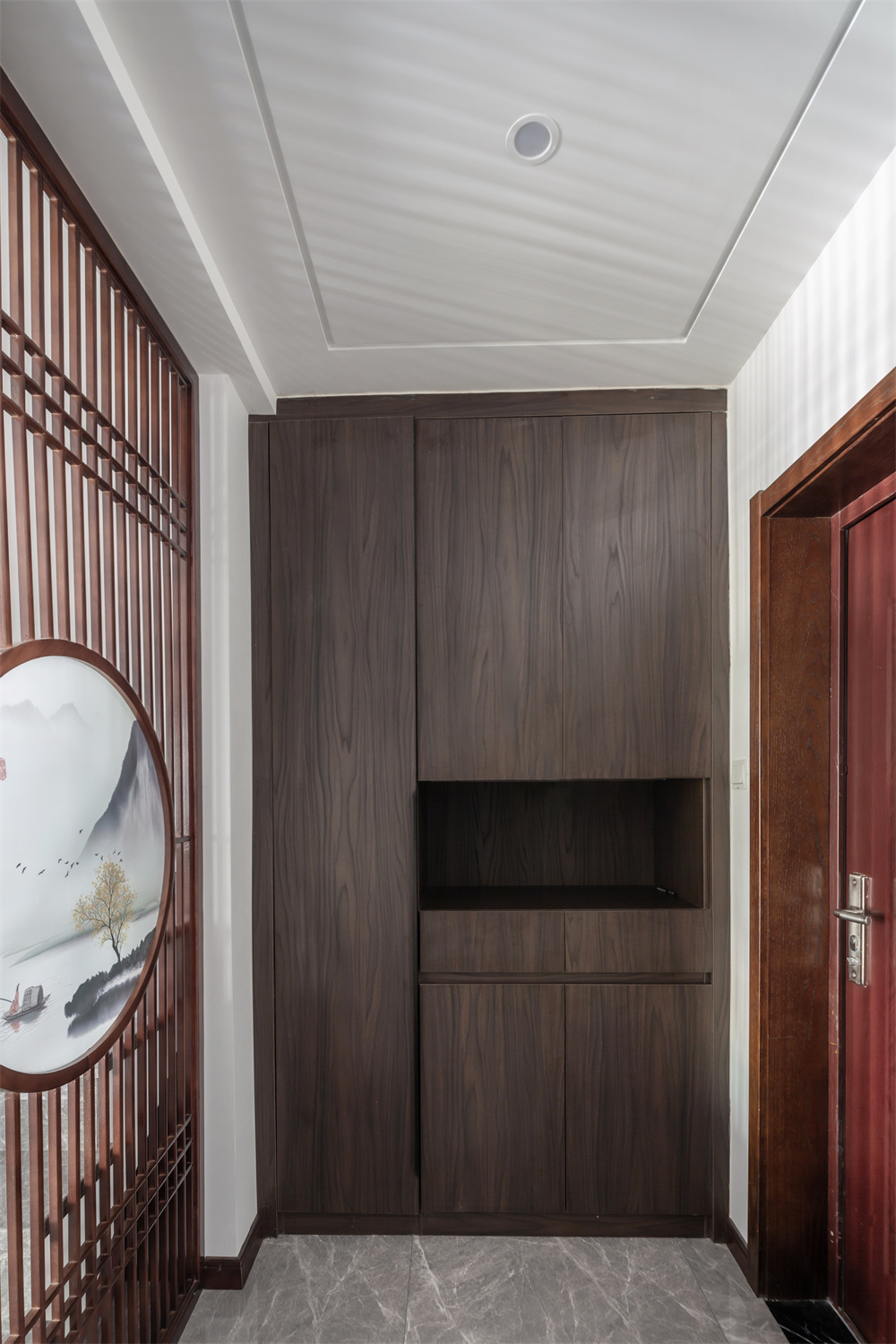 进门处便是整面到顶的衣柜,可以省去柜顶打扫的烦恼。玄关柜在右侧柜体中间做了镂空设计,便于日常放置钥匙、快递等小物件。