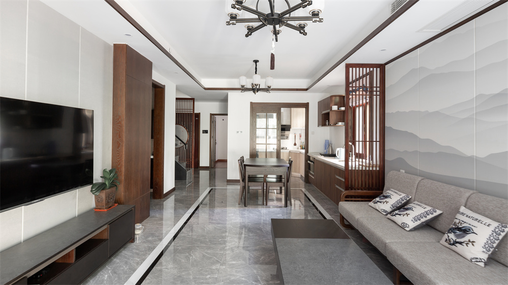 电视柜搭配沙发、茶几柜便组成了客厅。灰色系的棉麻质感的沙发十分舒适,绿植的点缀给中式风格的房屋增添了生机,也起到了净化空气的作用。