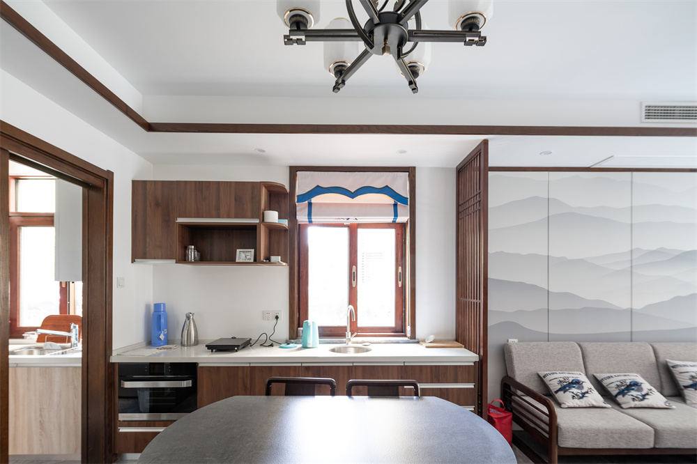 餐厅处没有多余的修饰,前方定制了整体的餐边柜,安装了洗手池、转角柜等设计,方便在吃饭后清洗手。窗户上面采用拉伸式窗帘的设计,在吃饭时便可看见窗外的景色。转角柜的设计便于放置一些热水壶、碗筷、抽纸等日常物品,在吃完饭便可拿取抽纸来擦拭。