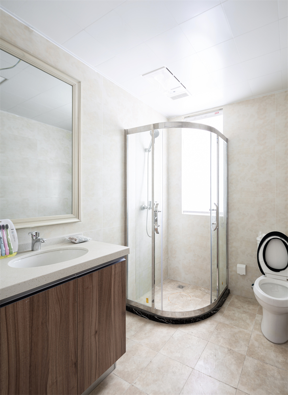 卫浴处水池面盆和洗浴间的设计是干湿分离做法的典范,首先洗浴间做了半包的设计,抬脚线高度足够的高可避免水的漫出,在洗澡之后便可以打开窗户进行通风散气。与水池连接的柜体下面留出一些距离,便于日常水汽的散发,且在卫浴间内没有多于物品的阻挡,可及时保持墙面和地面的干燥。