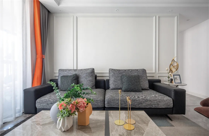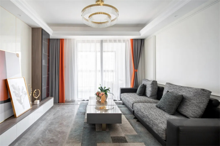 灰色皮质沙发一眼望去便能感受柔软的触感,白色的茶几下方铺上地毯,给轻奢增加一丝不寻常的味道,冬天可以把地毯抽出去孩子在上面玩耍,但是记得要及时打理。