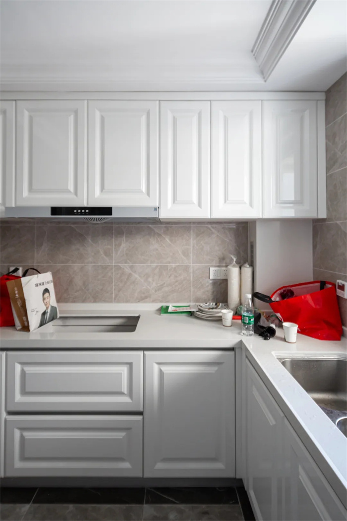 芬兰白膜压门板搭配大理石纹路的瓷砖,空间干净又简洁。厨房空间为典型的L字型设计,从做饭到洗碗家居动线流畅清晰。