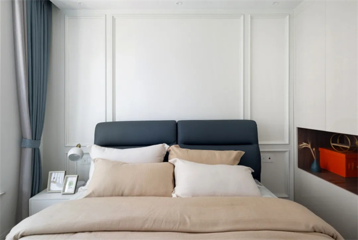 卧室采用膜压板背景墙,石膏线给背景墙增加层次感。飘窗处安置了护栏,为孩子的安全保驾护航。整面的衣柜处在左侧做了镂空,给白色增加点质感,显得小巧又实用。