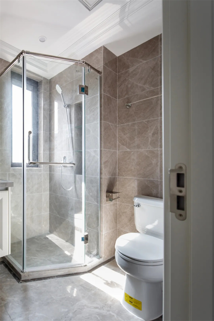 卫浴处下方先是芬兰白膜压门板,里处打造半包围形的淋浴间,下方踢脚线抬高避免水流的流出,整体卫浴间做到了干湿分离。