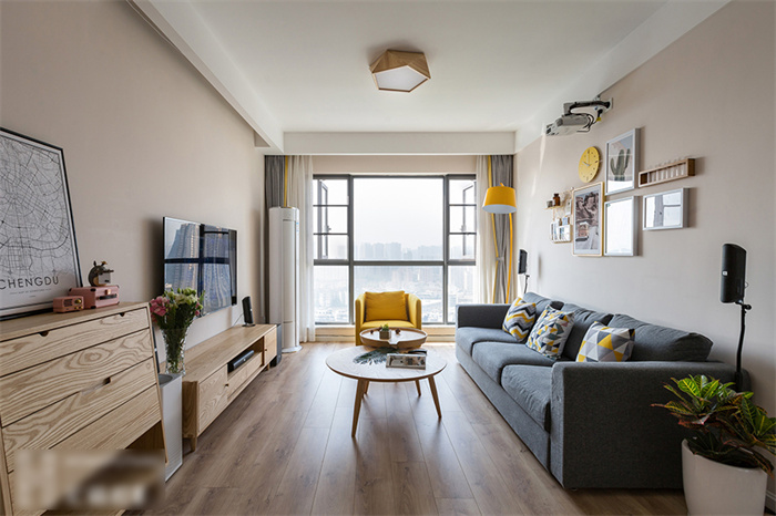为了迎合屋主对于自然气息的热爱,在地面和家具的处理上不难看出使用了大面积的原木色。两个大小不一、高度不同的茶几拼凑出时尚,亮黄色的灯具在驼色墙面的衬托下显色尤为出彩。或许,这才是家的正确打开方式......