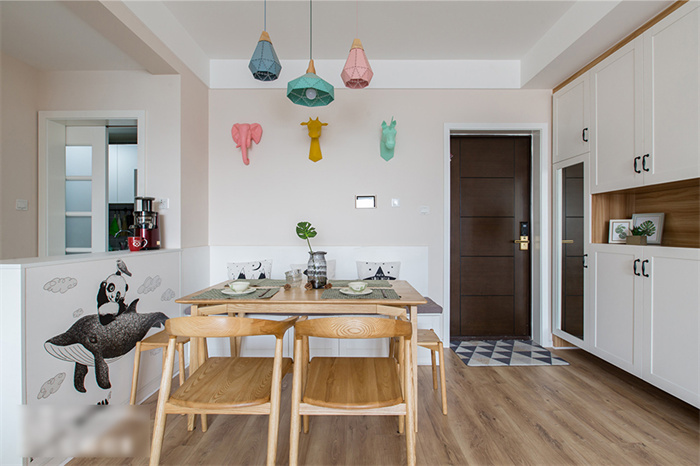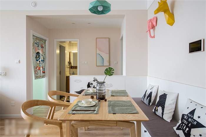 餐厅除了满足正常用餐的需求之外,还增加了收纳功能。为此星空(中国)xingkong在餐厅处专门定制了一排绕墙的沙发柜,这样家里就算多几个人来就餐,也不会显得拥挤。原木色的餐桌与马卡龙色系的吊灯平衡出北欧精致。餐厅墙面上,三种动物的挂件与同色系吊灯在鲜明的颜色中演绎着北欧风情。