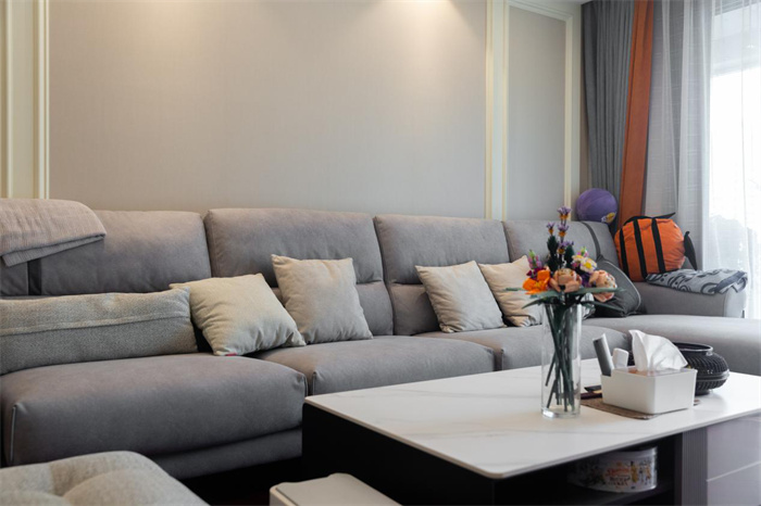 客厅整体由电视背景墙、茶几和沙发组成,绿植和花瓶的摆放让客厅空间熠熠生辉。
