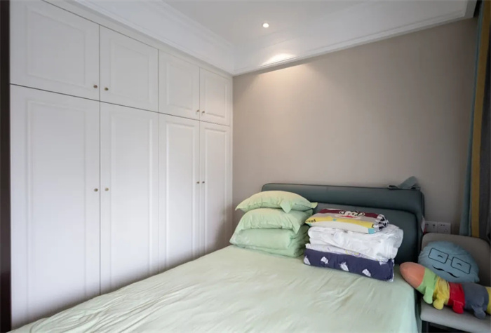 一侧整面到顶的衣柜,两开门的衣柜设计,精美的膜压门板花纹,给空间增添一丝层次感。金色的立体把手减少了拉开门时的阻力。在打造的时候要注意衣柜与床铺之间的距离,避免拉开的时候与床边相碰撞。