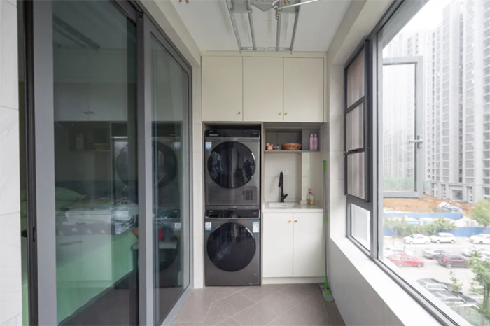 通过阳台可以看见窗外郁郁葱葱的树木,小区的居住环境优美,安静宜人。阳台呈现狭长的形状,一侧为洗衣机柜,根据两个洗衣机的高度比例进行打造,上方较高的柜体放置一些洗涤用的杂物,下方放一些衣架便于拿取。洗衣机柜与餐边柜为同样的门板颜色和把手形状,打造起来比较省心。