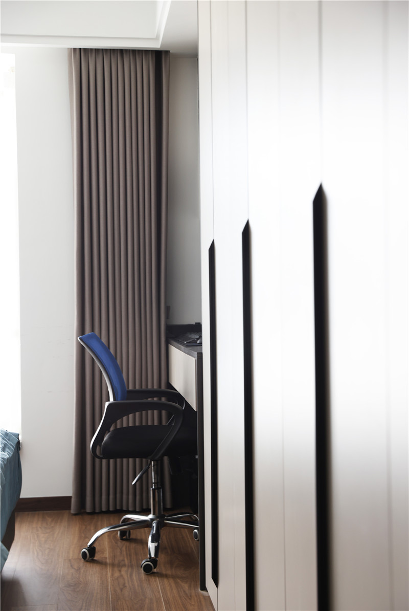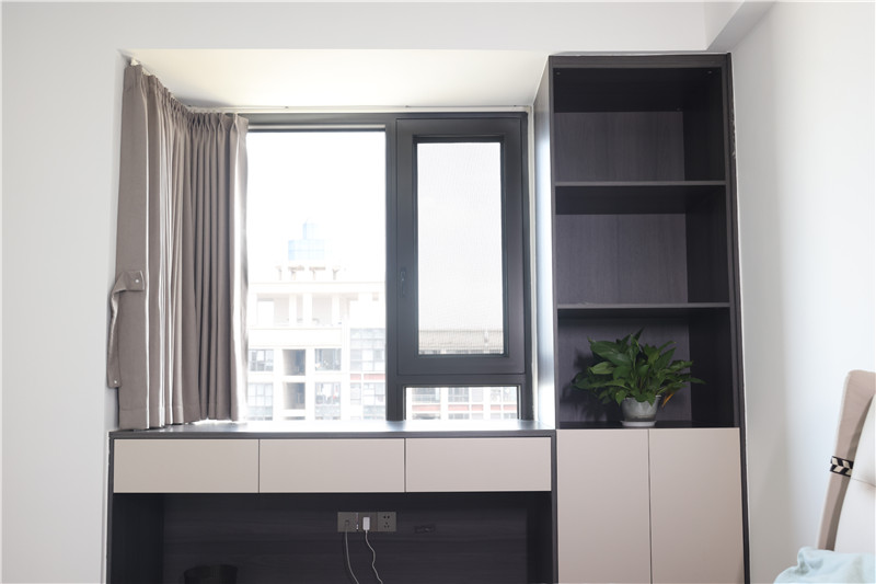 靠窗作书桌与收纳柜,与衣柜选用同种材质,整体和谐统一。开放格设计不仅可以充当装饰柜与收纳柜,还可以让空间在视觉上更开阔。