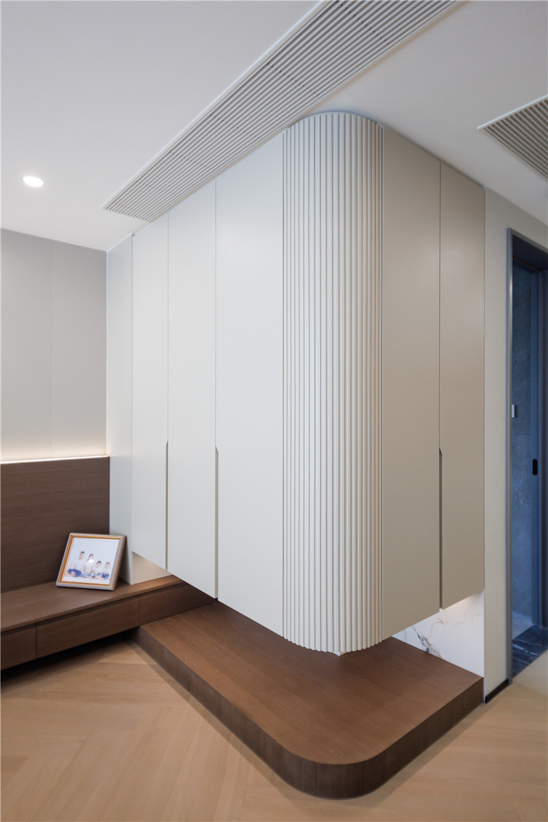整体的设计以白色系为主,但在细节上大有异同。玄关柜采用茶白柜体,柜内空间做斜插式的设计,可以让柜子看起来更薄,更轻盈。