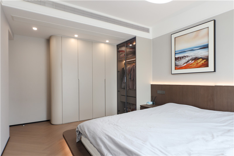 推开与餐边柜相连的门即进入主卧空间,打通了卫生间和衣帽间的设计让主卧变身功能性十足的高品质卧房。