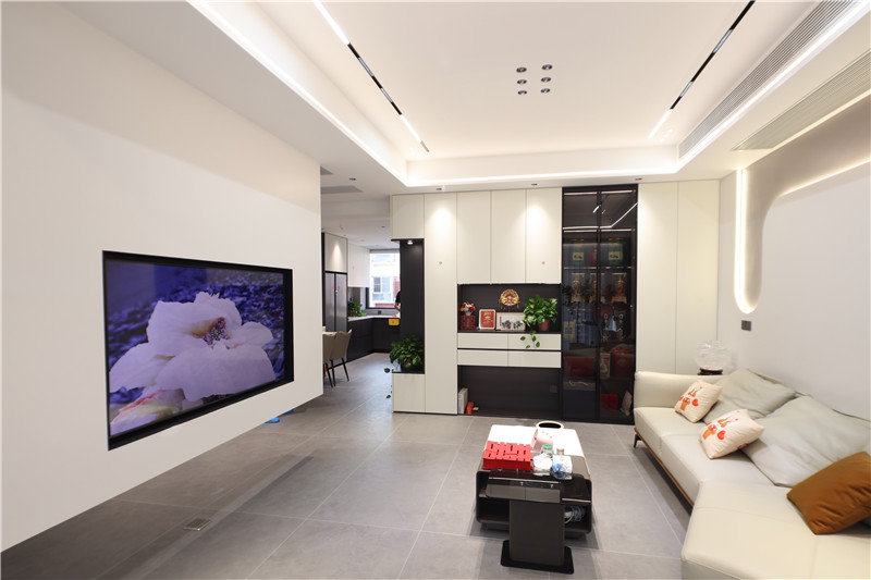 电视背景墙整体挑高处理,内嵌电视机,“躺平”式观剧一整个爽住,还方便卫生清理;沙发背景墙做圆弧造型颇富艺术感,配以灯光的运用,氛围感跃于空间。