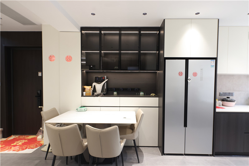 到顶餐边柜,采用芬兰白门板与黑木纹柜体,跳色设计更具视觉冲击力;中部掏空预留,可放小物件及咖啡机等小电器。