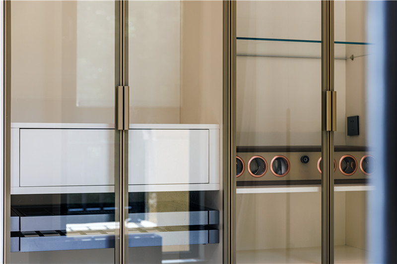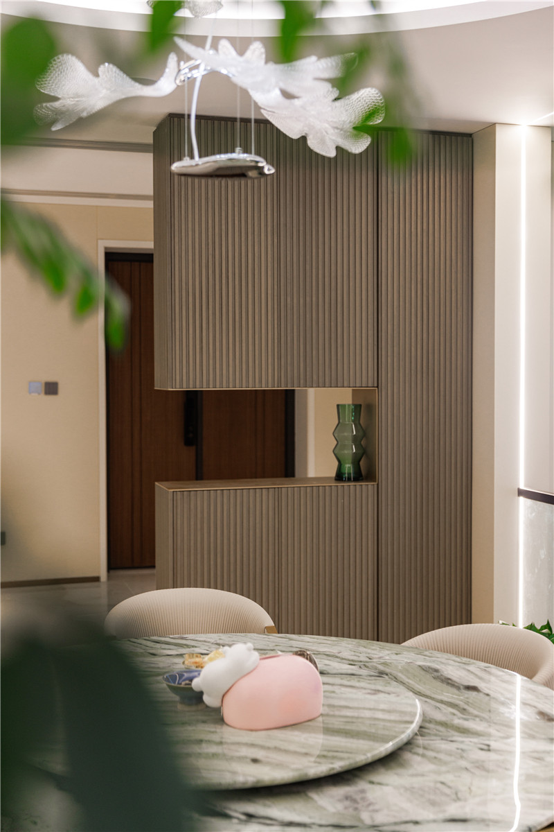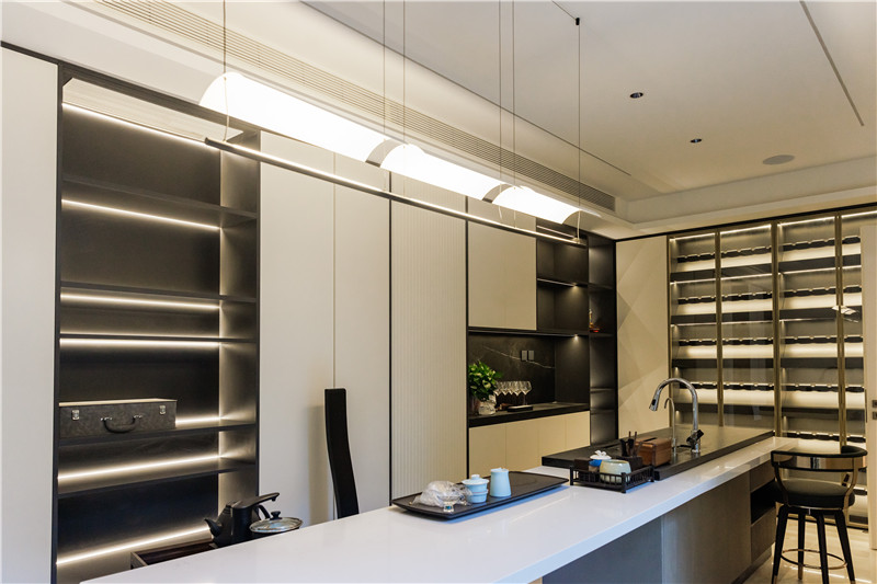 靠近庭院的里间做成了茶室和酒柜的结合区域,似船帆般的吊灯颇有雅奢气质,酒柜在各种灯光的照射下颇显不凡质感。推杯换盏,觥筹交错,在这空间里,品的是茶或是酒,赏的是树或是叶,感悟的是人生。