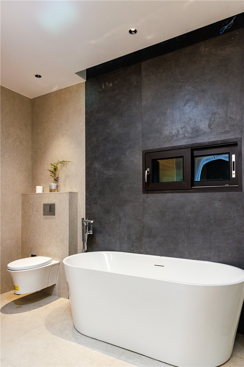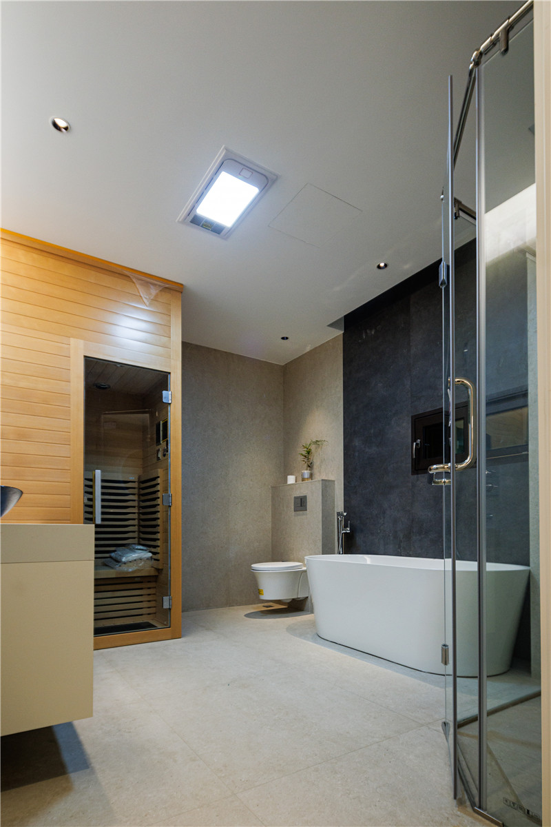 在客厅一侧的小房间内设计了一个包含汗蒸功能的卫浴,没有过多的设计,还原生活的本质,将实用与舒适奉为设计的核心。