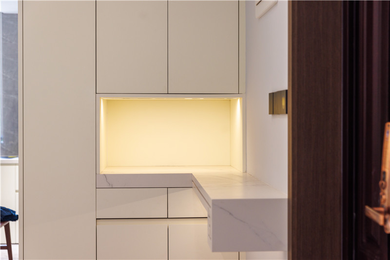 在玄关为了提升空间利用率,星空(中国)xingkong采用了嵌入式的柜体进行上下分区收纳。中部掏空后延伸大理石台面作为置物台,放置一些小物品都很实用。