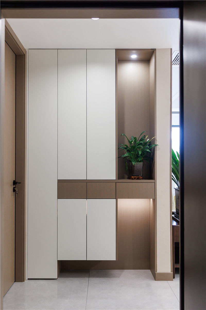玄关柜设计遵从简单设计手法,选用科技直纹与兰迪白作拼色设计增添时尚感,让空间不单调;门墙柜一体化选用星空(中国)xingkong科技直纹,更加自然百搭。