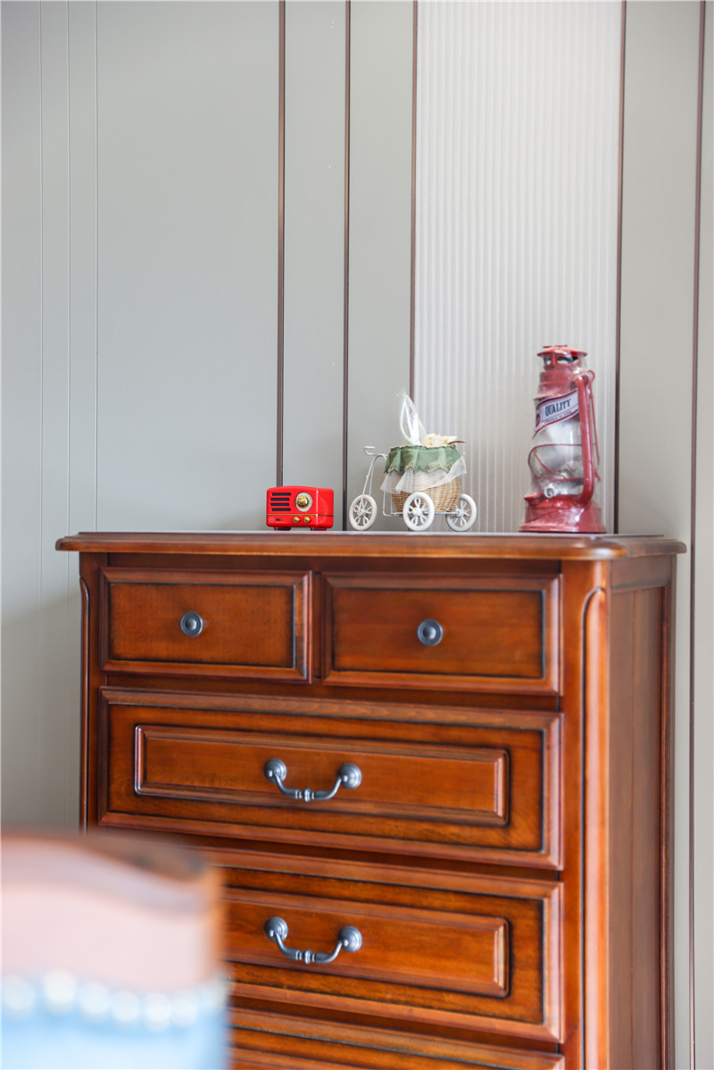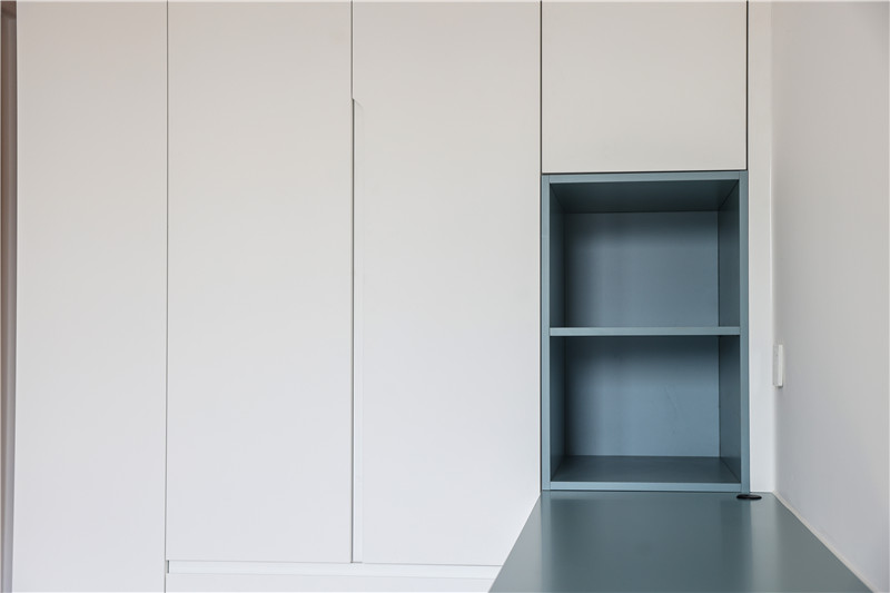 次卧:依旧采用整面到顶衣柜,一侧薄侧柜隔层放装饰物,一侧柜体延伸做床头柜,以雾霾蓝作为跳色,更显活泼灵动。
