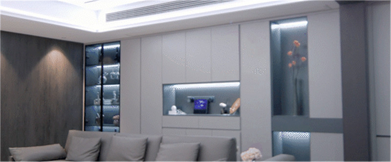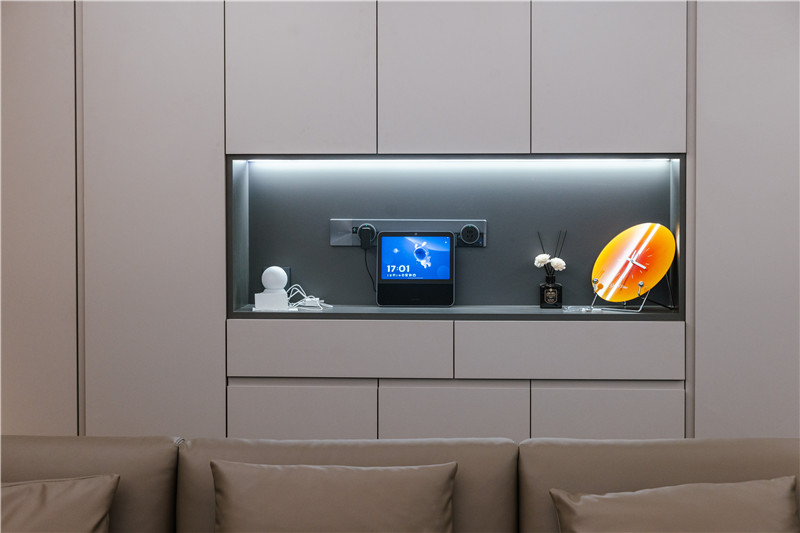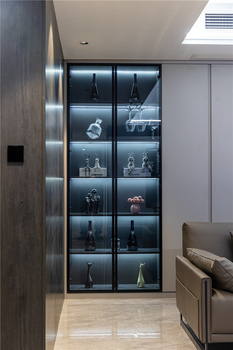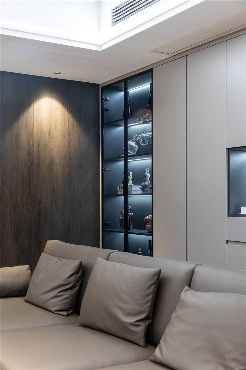 一侧玻璃展示柜,是手办区亦是藏酒区;一侧穿插设计嵌入灯光,是家里的氛围区;中部整面立柜,在合适高度掏空并预留轨道插座,实用性强。