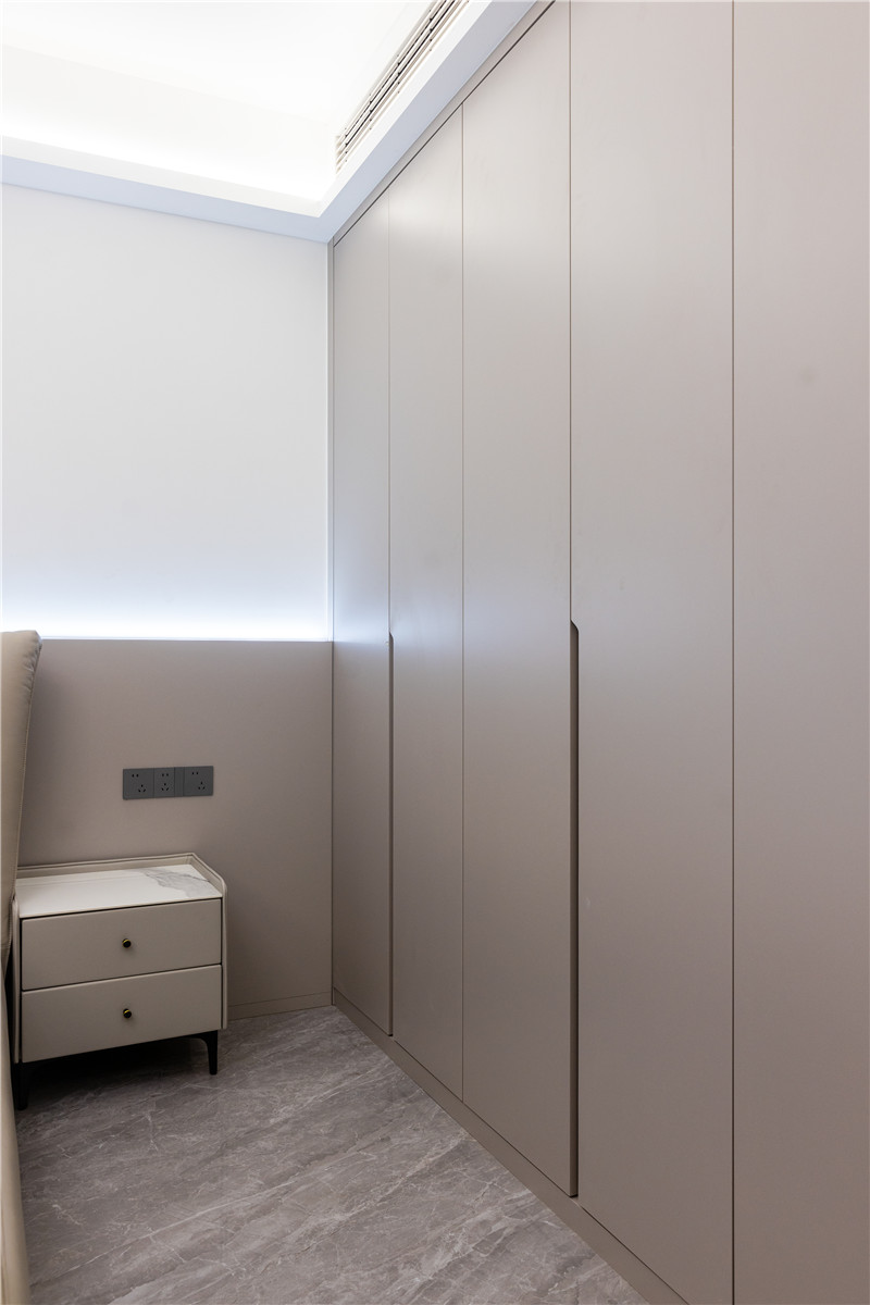 梳妆台与床头柜结合,上方做开放区并嵌入条带灯,有效解决视觉死角问题;抽屉做无拉手,避免梳妆时的遮挡;侧边衣柜到顶设计,边角做薄侧柜,存储在线。