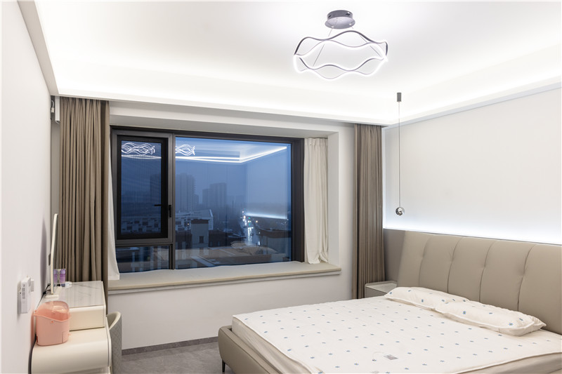 飘窗区铺上毯子,铸就休闲赏景一角;梳妆台为组合柜体,以高度差异实现功能互补;床头背景墙色彩拼接,以辅灯点缀及艺术灯增强美感。