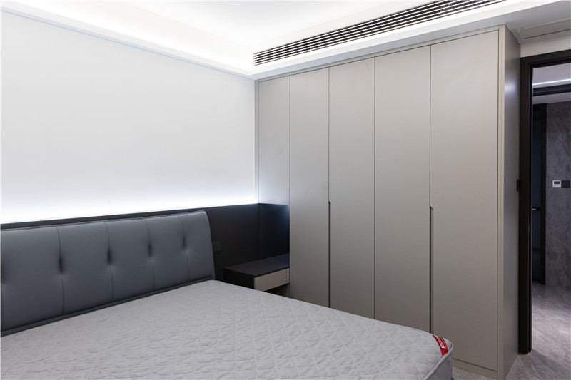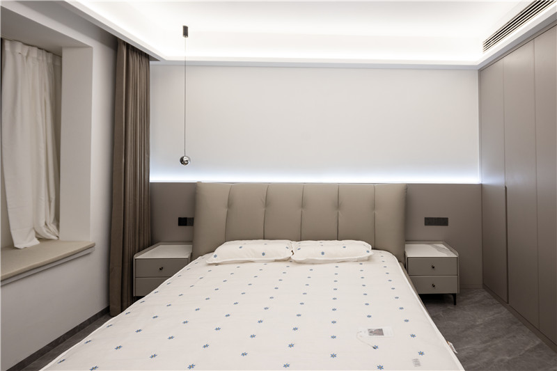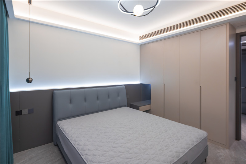 卧室作为休息和独处的空间,安静而温馨是必须的,颜色搭配、功能收纳的协调统一,是屋主品质追求的外在呈现。