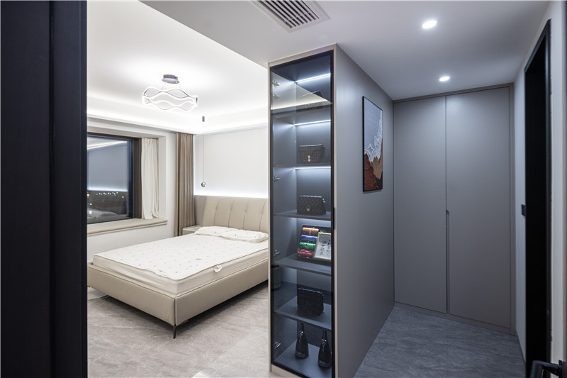 一组衣柜作为隔断分离出小型衣帽间,一柜双用突显设计智慧;隔断柜窄侧玻璃柜展示,与众不用;内侧立柜双开,可根据屋主需求进行合理分区,为便捷高效的找寻助力。