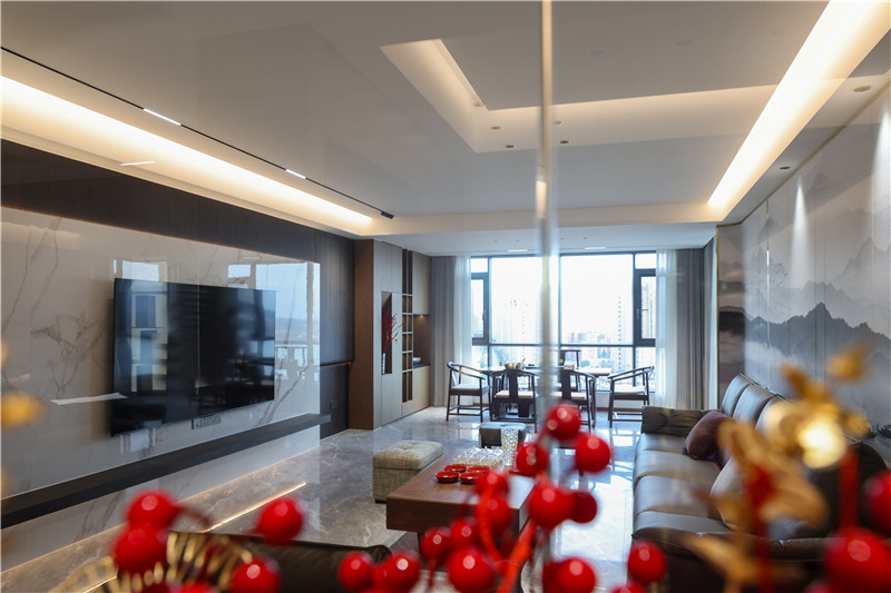 电视背景墙内里整面木材拼接整块大理石板,彰显层次感;背景墙外嵌铝板及整面木板,发挥收纳桌及展示柜效用。