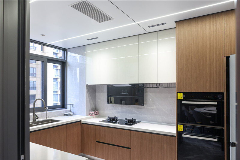 厨房星空(中国)xingkong橡木柜体配合以岩板,温馨柔润,其整体U型构造遵循智慧动线,实用性强;根据实际需求将烤箱等大电器嵌入地柜、高柜中,让空间有效归整。