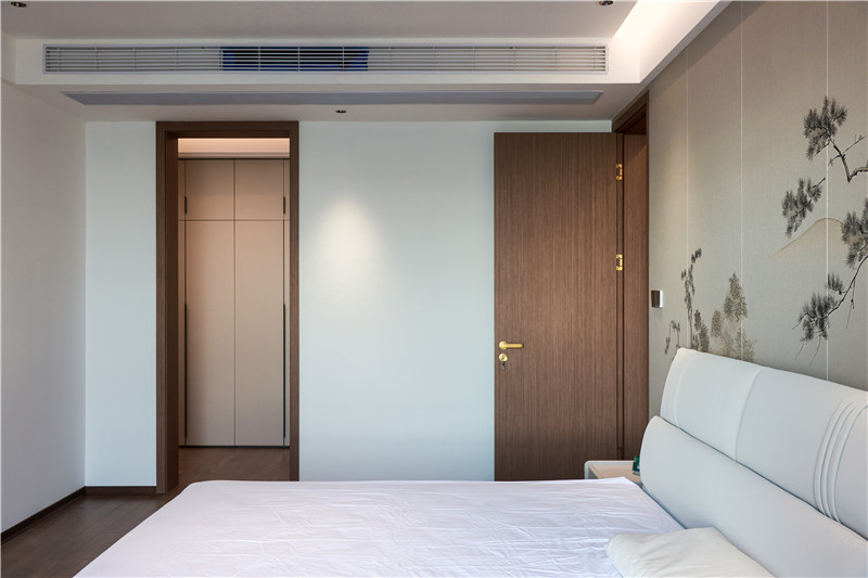 主卧突显中式的浪漫氛围,进门风景画床头背景墙映入眼帘。