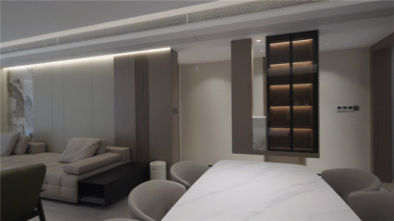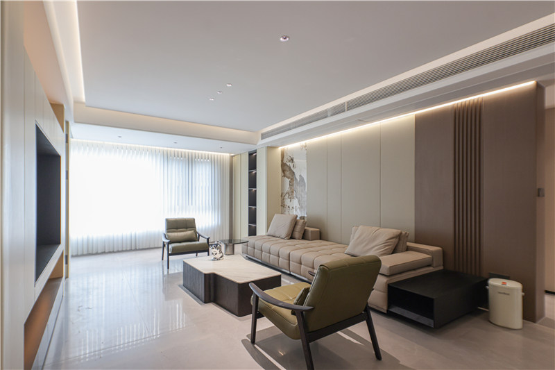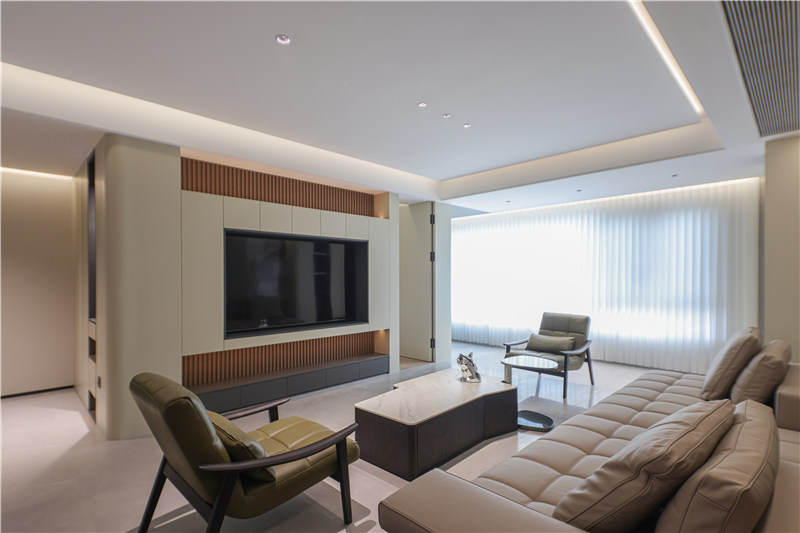 电视柜以木色格栅及辅助灯光建立层次感,电视机内嵌、灰调一字型底柜视觉加深,主次分明;沙发背景墙为拼接式设计,大理石花纹、水漆背景墙、纵向格栅衔接,好看雅致。