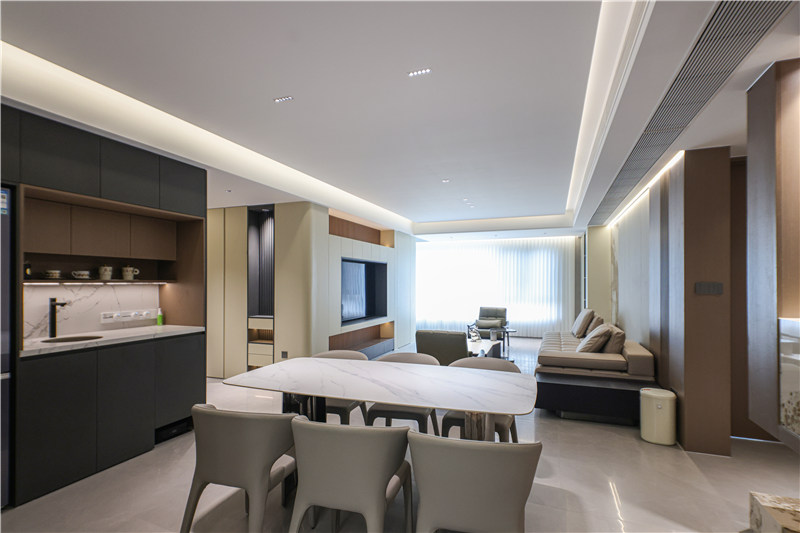 餐边柜整体无拉手设计,将冰箱一整个嵌入其中,视觉和谐统一;中部掏空预留清洗区,上方为餐具开放区,便捷实用;底部留空可放扫地机器人等电器。