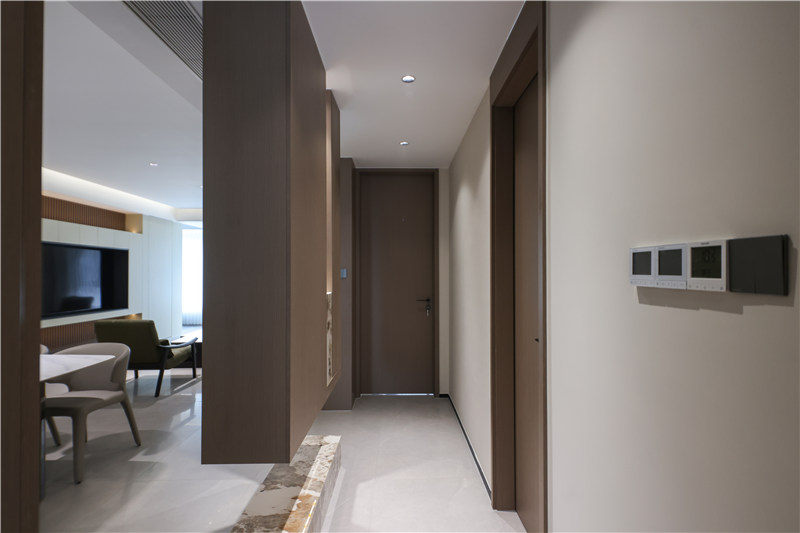 进门玄关柜与电视柜组合,连接处以圆弧收边,杏仁黄色调通铺展现高级柔和气质。玄关侧边高柜便捷挂衣,中侧穿插抽屉、背板跳色配合以栅格造型,彰显个性化美感。