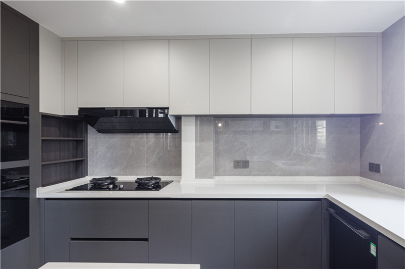 橱柜为水洗灰门板,内嵌烤箱等电器,节约空间;台面岩板耐刮防渗水,台下盆设计更方便打理;洗切烹盛动线,优化空间。