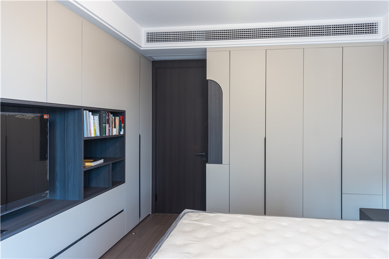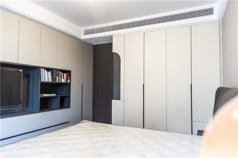 次卧满足了功能上的生活需求,进门一字型立柜,水漆茶白门板+无拉手设计,简约利落。