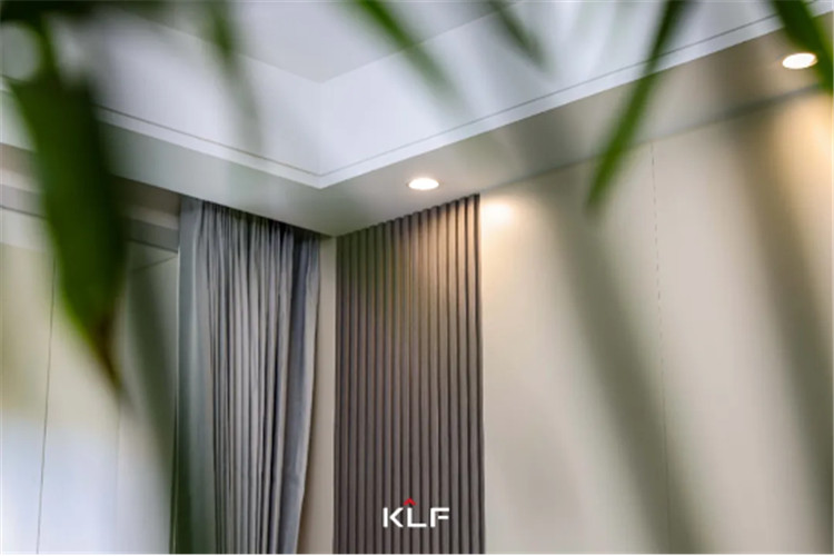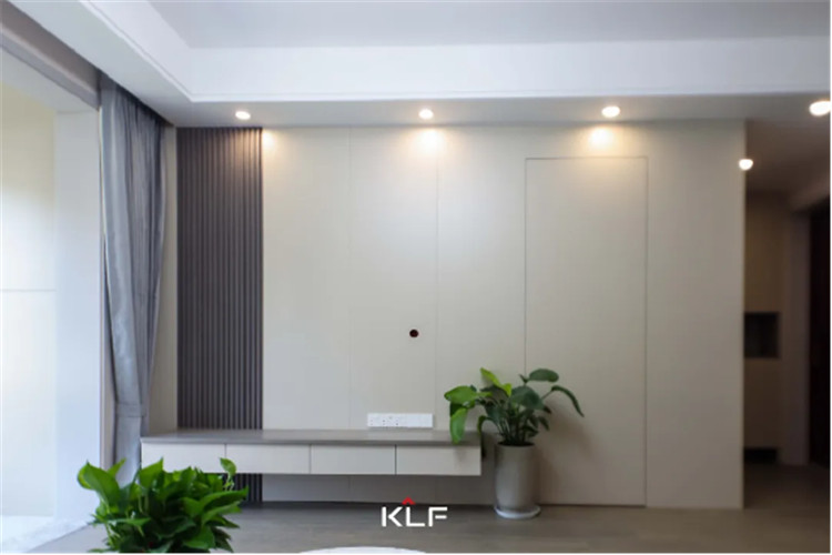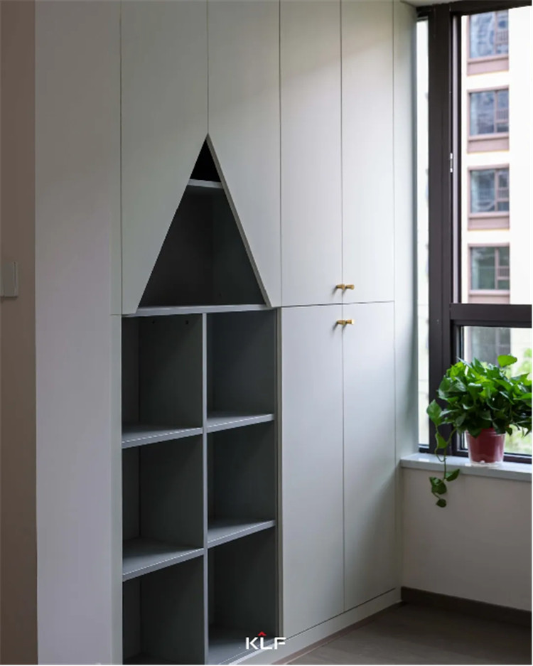 电视柜一侧做了隐形门,让屋内的儿童房更加隔音,更具私密性。墙板一侧做了格栅,偶然的跳脱丰富了整体的设计,门墙柜一体化的设计也从视觉上让空间看起来更干净,显大又高级。