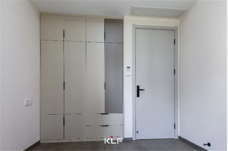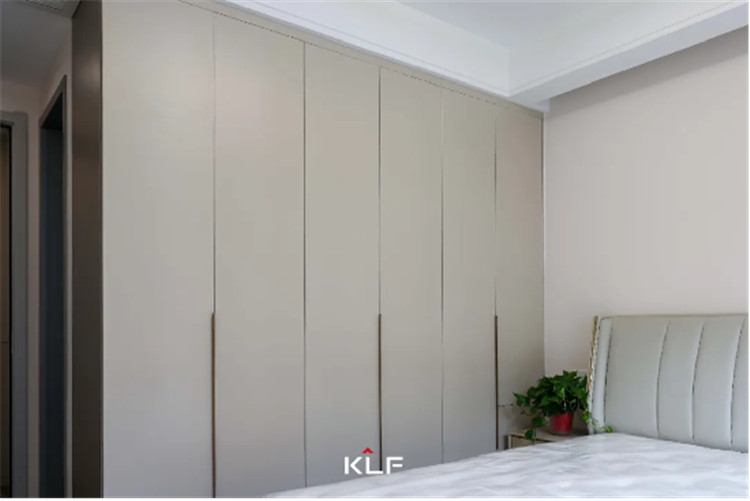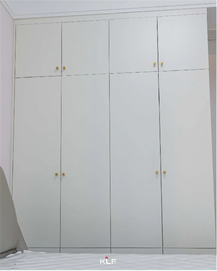 主卧室作为屋主的休息区,整体更强调收纳性和舒适度,采用茶白的色彩与全屋白色系更适配,一门到顶的整排衣柜采用的是一字型通体拉手,方便使用。