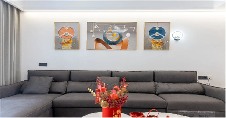 在沙发背景墙这一面,屋主则是选择悬挂几幅喜爱的挂画,这样的装饰手法很常见,也很灵活,可以根据屋主的喜好随时改变,更为现代。