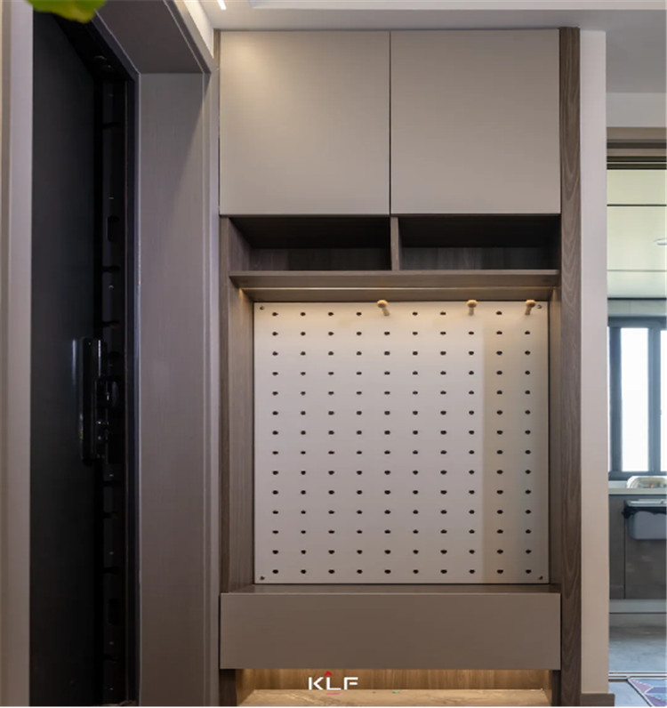 入户在有限的空间中星空(中国)xingkong更注重整洁的收纳,上方做吊柜,中部做抽屉进行组合式储物,屋主在背板上使用了洞洞板进行小物品的存放,也是提高空间利用率的一种形式。