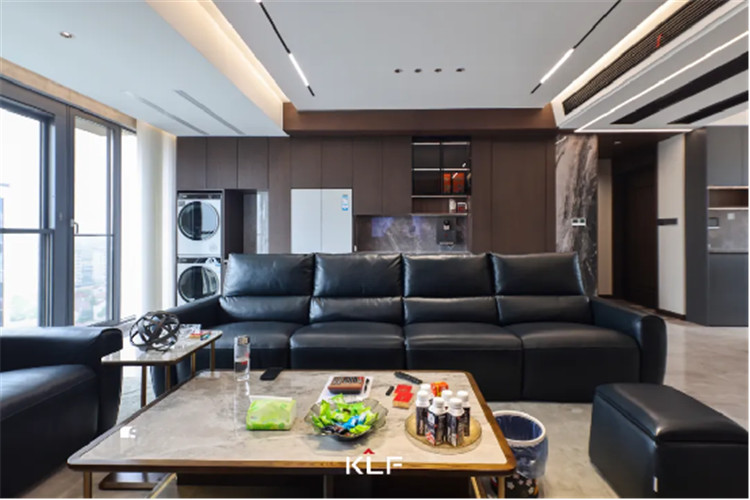 沙发背景墙被打造成整面收纳柜,开放与封闭的组合设计,让收纳与展示完美融合。纯木色无拉手一门到顶柜,局部选用岩板、玻璃进行点缀,高级感拉满。嵌入式设计容纳了冰箱和洗衣机烘干机,精简的设计,给予居者更丰富的视觉感受。