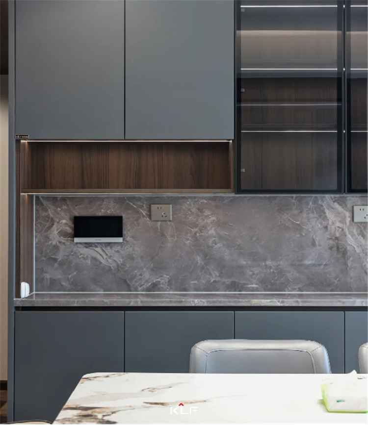 整面餐边柜立于大理石餐桌一侧,储物及展示功能拉满的同时,线条和形式的韵律演绎出现代化的家居美学。色调柔和、质感高级的水漆柜搭配上通透玻璃,清新淡雅,营造典雅隽永的氛围。
