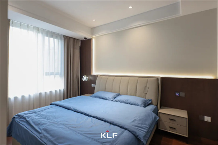 卧室没有过多繁琐的装饰,床具造型简洁、线条流畅。用木质护墙板打造半高床头背景墙,恰到好处的留白,空间更灵动。