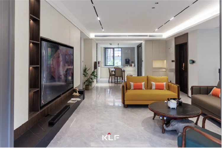围合式的空间布局里,电视柜成为环境的主角,以纳科榆木打底,再以芬兰白柜体进行生活收纳。