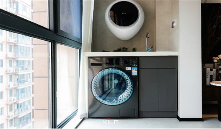 阳台与客厅连通,没有进行封闭式的处理,从而光线可以得到延伸,客厅空间更加通透温暖。阳台一侧做洗衣区,一侧做悬空式酒柜,半透黑玻设计精致不张扬。